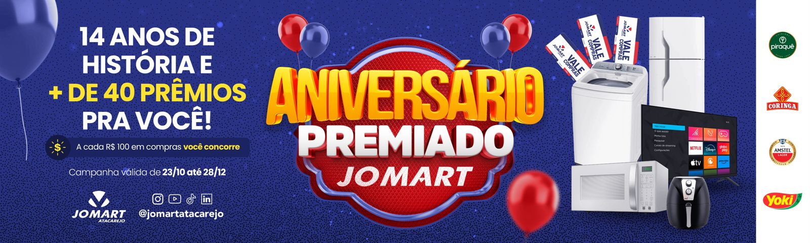 O Jomart Atacarejo vai celebrar em grande estilo seus 14 anos de história. A partir da próxima quinta-feira (23), a rede lança oficialmente a campanha “Aniversário Premiado Jomart”, uma ação especial que vai se estender pelos próximos três meses, com ofertas exclusivas e mais de 40 prêmios sorteados entre os clientes.