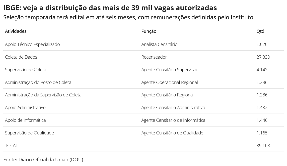 De acordo com a portaria, as pessoas selecionadas atuarão em diversas funções, com quantitativos já definidos. A maior parte das vagas é para o cargo de recenseador, responsável pela coleta de dados, com 27.330 oportunidades.