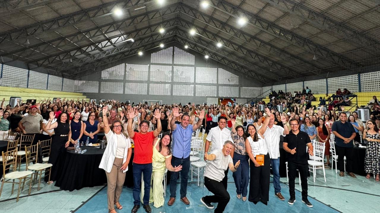 O evento aconteceu no Ginásio de Esportes Hidemburgo Pereira, no dia 04, e contou com a participação de gestores escolares, secretários e assistentes educacionais, professores, auxiliares e recreadores da Educação Infantil, professores dos Anos Iniciais e Finais, profissionais do AEE e da EJA, equipes das salas de leitura, merendeiras, AUSEGs, chefes de disciplina, porteiros e profissionais das escolas em tempo integral.