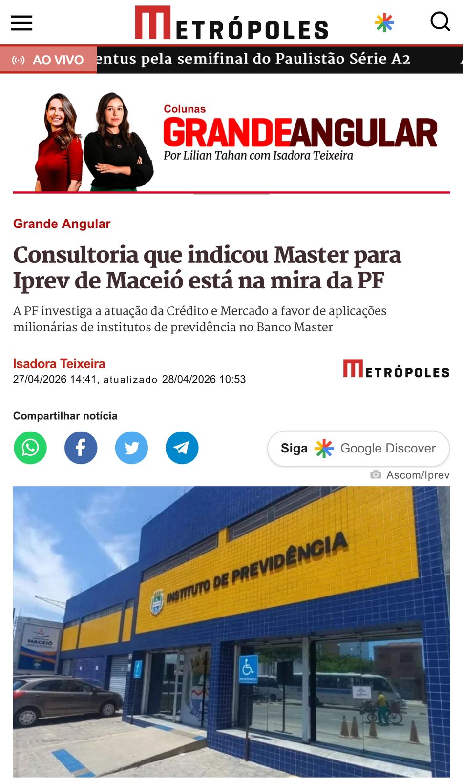 Segundo a coluna, a PF investiga a atuação da Crédito e Mercado a favor de aplicações milionárias de institutos de previdência de cidades paulistas. A empresa assessorou o Iprev de Maceió, que era comandado por Ronnie Mota, durante a gestão do prefeito JHC, que investiu R$ 117 milhões em letras financeiras do Banco Master, além de R$ 51 milhões em fundo imobiliário.