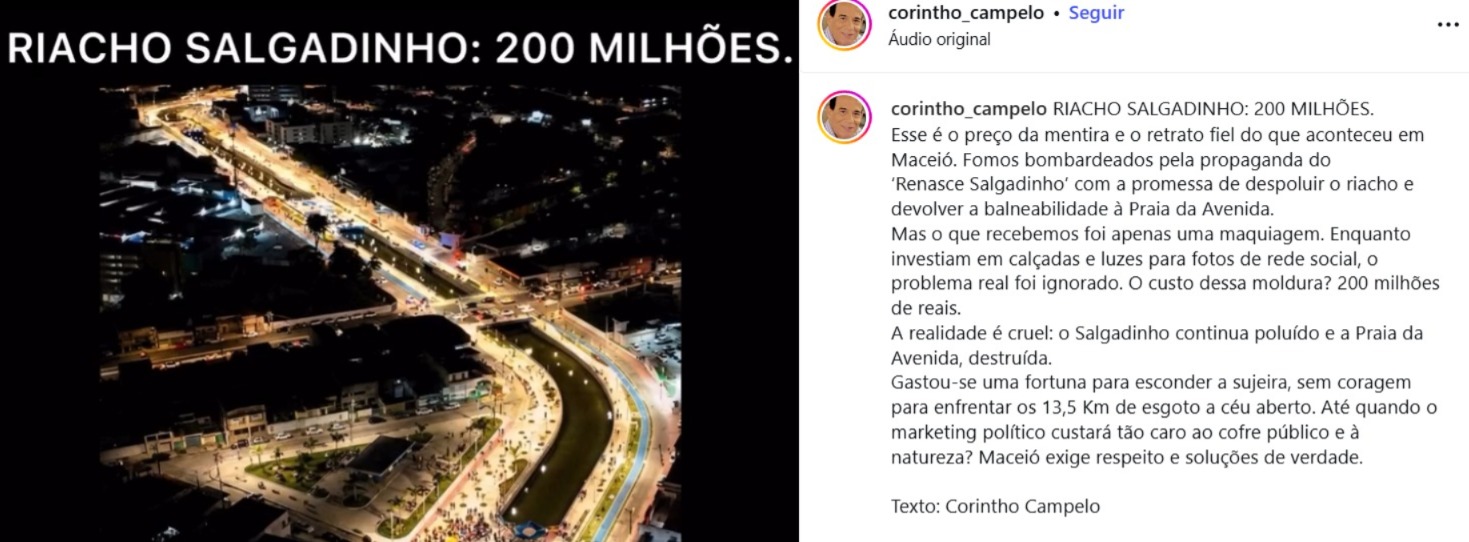 O ex-prefeito de Maceió, Corintho Campelo realizou uma série de postagens questionando os custos do projeto de revitalização do Riacho Salgadinho. Ele cobrou publicamente maior transparência sobre os custos da obra executada durante a gestão do ex-prefeito JHC.
