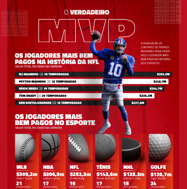 Com apenas 25 anos, o quarterback Patrick Mahomes é a promessa da National Football League (NFL) para os próximos dez anos e pode se tornar o jogador mais bem pago dos EUA. Ele tem o potencial de ficar financeiramente acima de todos os outros atletas, por mais de US$ 100 milhões, quando chegar aos 36 anos.