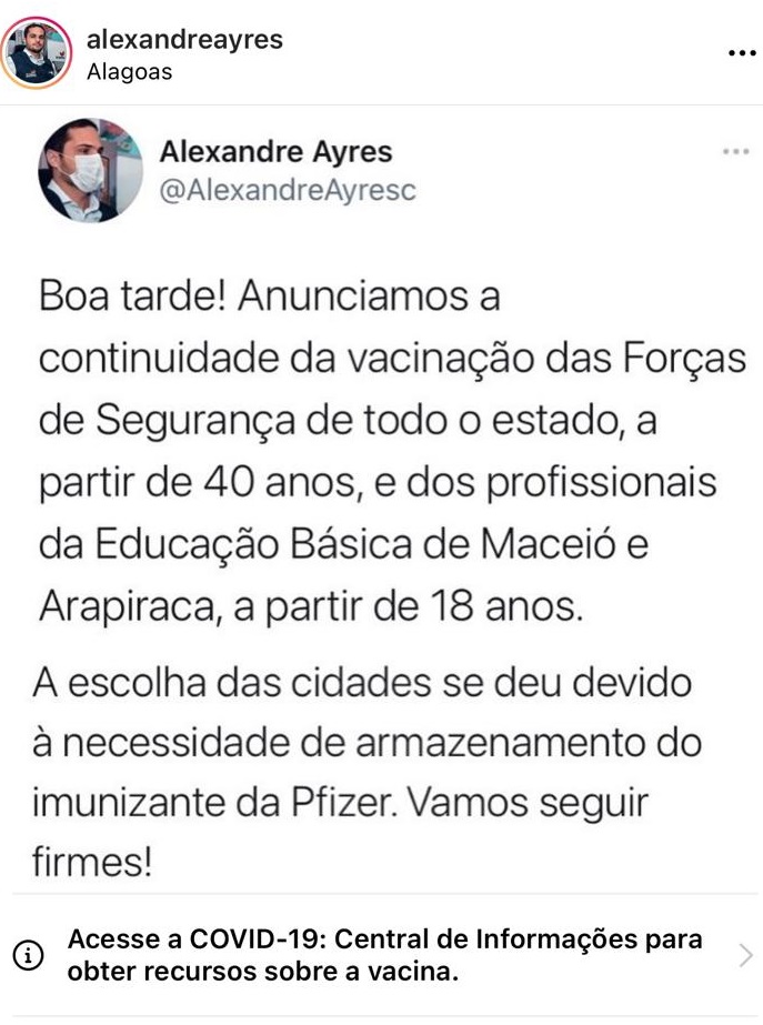 Em sua rede social, o secretário da saúde de Alagoas, Alexandre Ayres, anunciou no início da tarde desta quinta-feira (13), a ampliação da vacinação para os professores da Educação Básica de Maceió e Arapiraca e também para profissionais da segurança pública com mais de 40 anos.