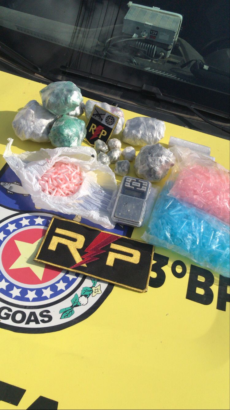 Ao todo foram apreendidos: 298 pedras de CRACK, aproximadamente 25g, 184 pinos de cocaína, aproximadamente 50g, 279 bombinhas de maconha, aproximadamente 800g, 2 aparelhos celulares, balança de precisão e R$ 150,00 em espécie.