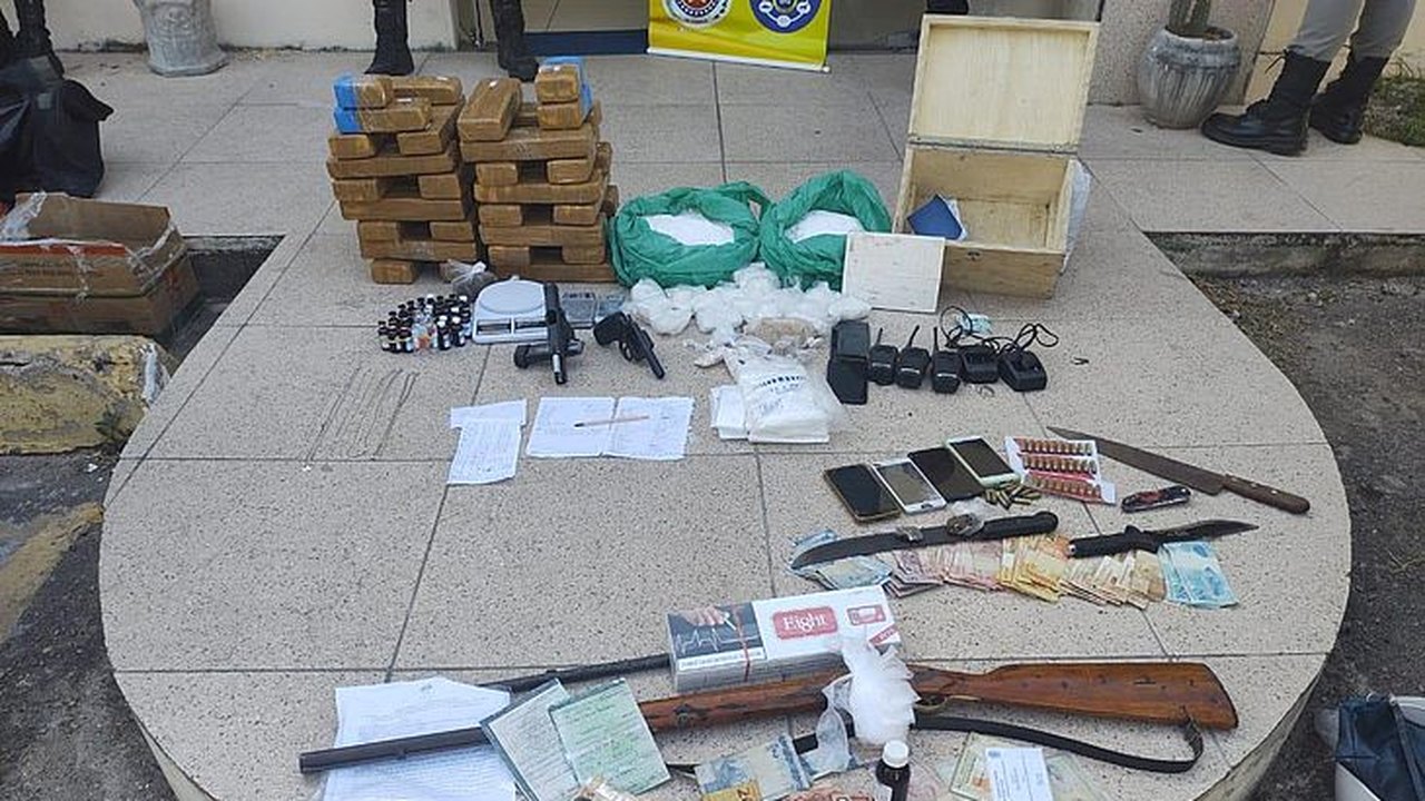Até o momento foram apreendidas uma espingarda, uma pistola .40 e um revólver calibre 32. Além de cocaína e tabletes de maconha, dinheiro, celulares e outros equipamentos. O material entorpecente ainda será pesado e o total apreendido será divulgado em breve.