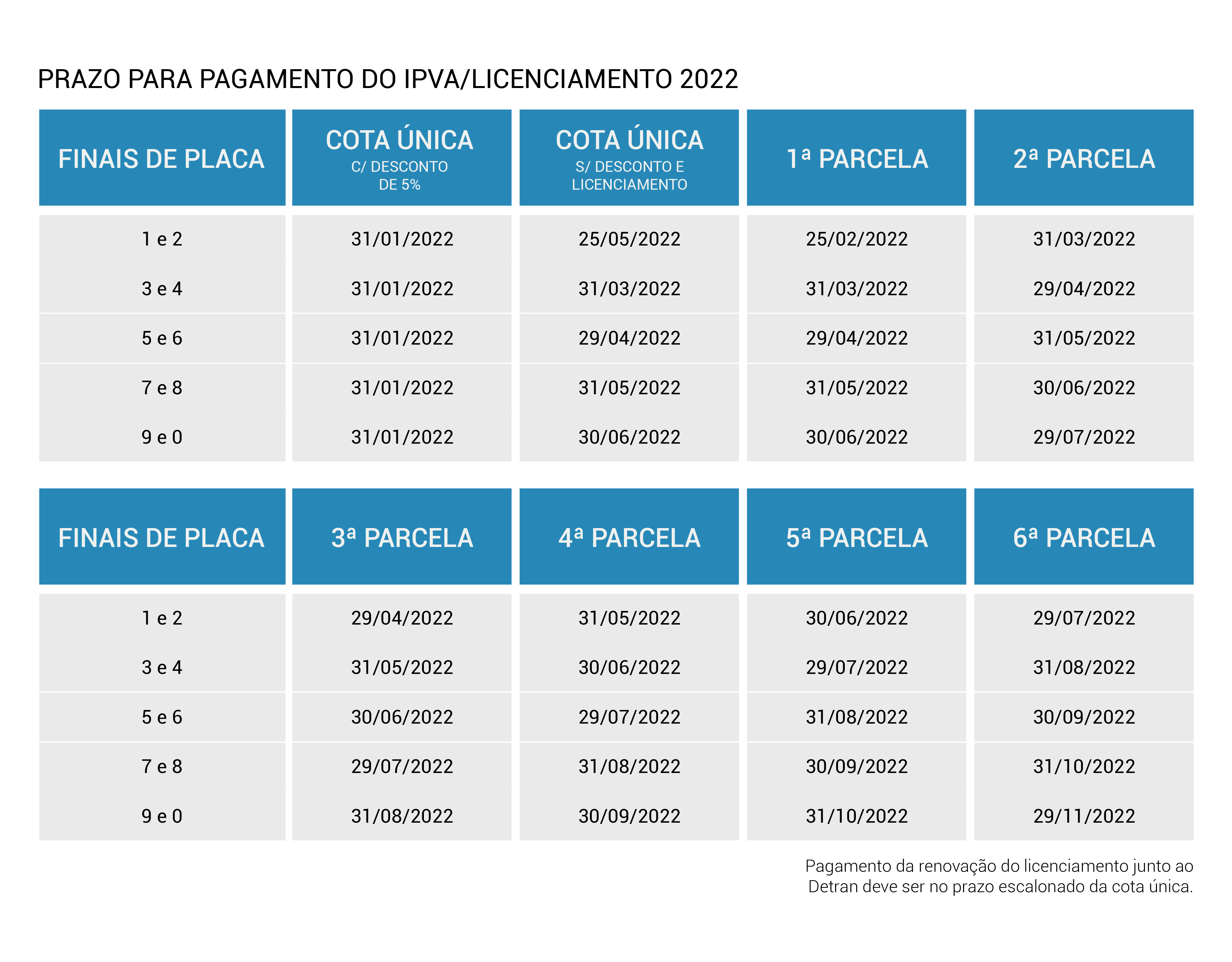 Cada final de placa possui uma data-limite para pagamento da cota única sem desconto ou da primeira parcela. As placas de finais 1 e 2 têm até 25 de fevereiro; placas de finais 3 e 4 até 31 de março; placas de finais 5 e 6 até 29 de abril; placas de finais 7 e 8 até 31 de maio e as placas de finais 9 e 0 até 30 de junho.