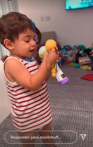 O papai babão mostrou o pequeno se divertindo com um microfone de brinquedo.