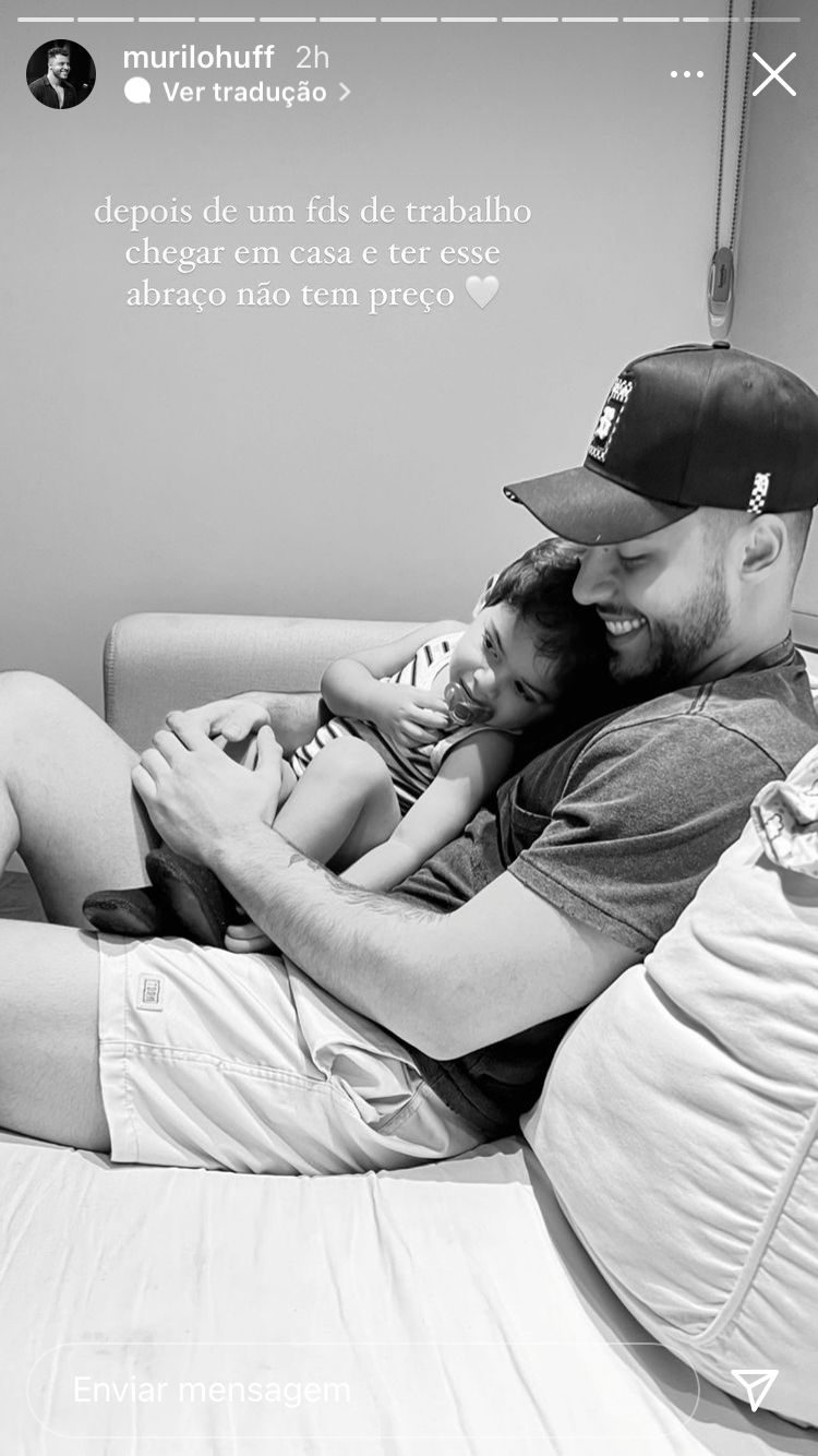 Momentos antes, Murilo compartilhou um clique em preto e branco em que aparece sorridente sentado no sofá com o herdeiro no colo após cumprir agenda de shows e voltar para casa.