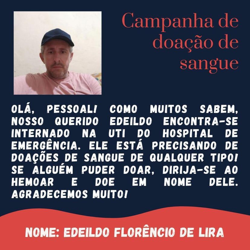 Familiares e amigos de Edeildo Florêncio de Lira estão realizando uma campanha de doação de sangue para o motorista de aplicativo que está na UTI do Hospital de Emergência do Agreste de Arapiraca.