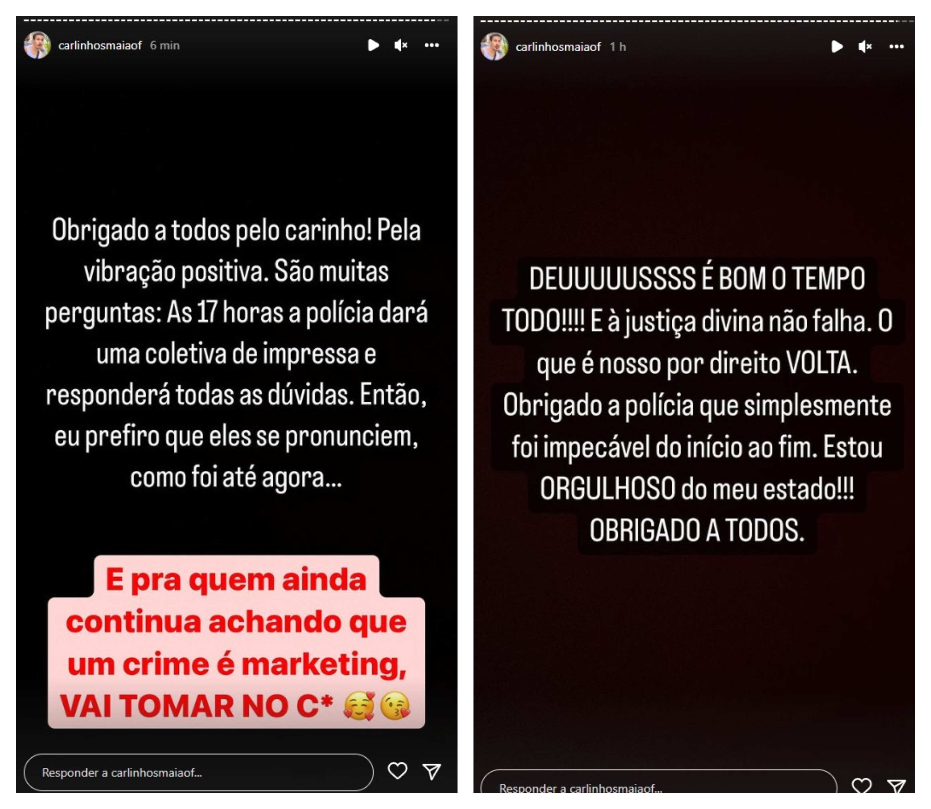 Em suas redes sociais, no começo da tarde deste sábado, Maia agradeceu a polícia e ao empenho da imprensa que ajudaram a cobrar celeridade na investigação do caso.