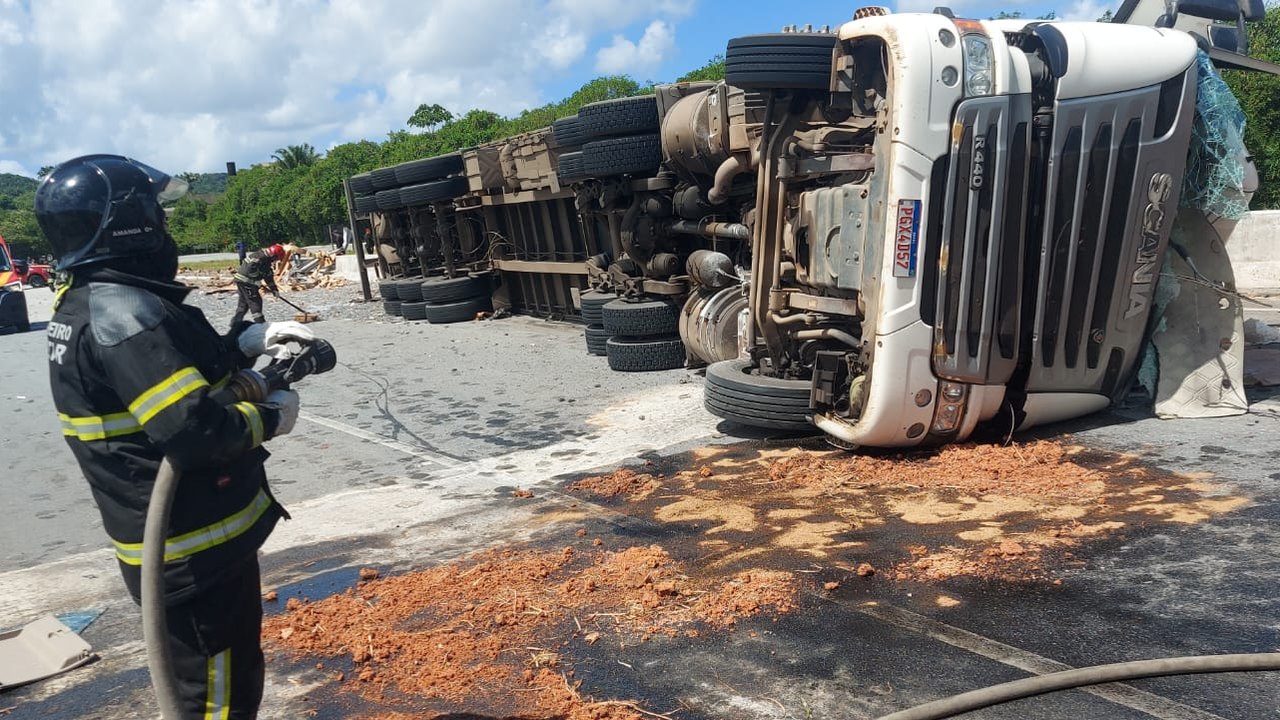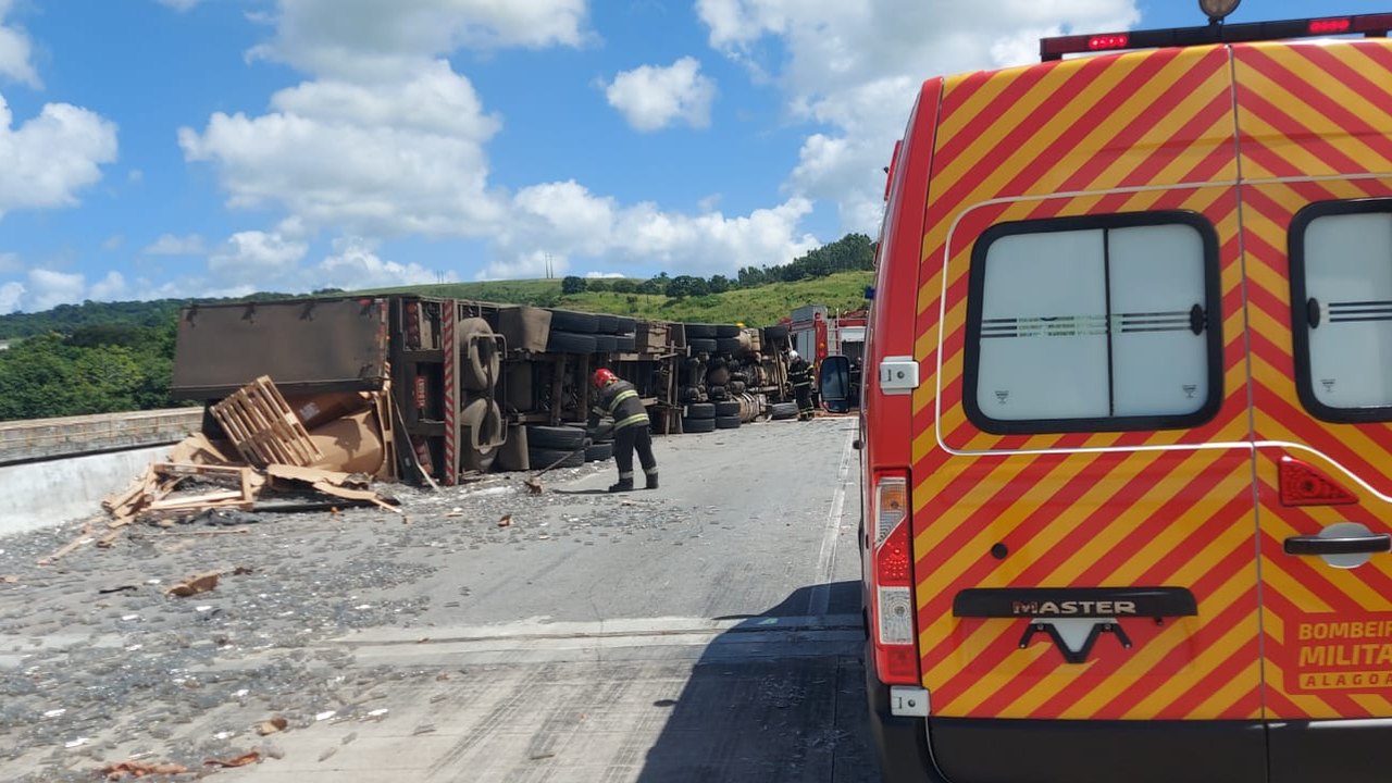 Homem fica preso às ferragens em tombamento de carreta na BR 101, em Pilar