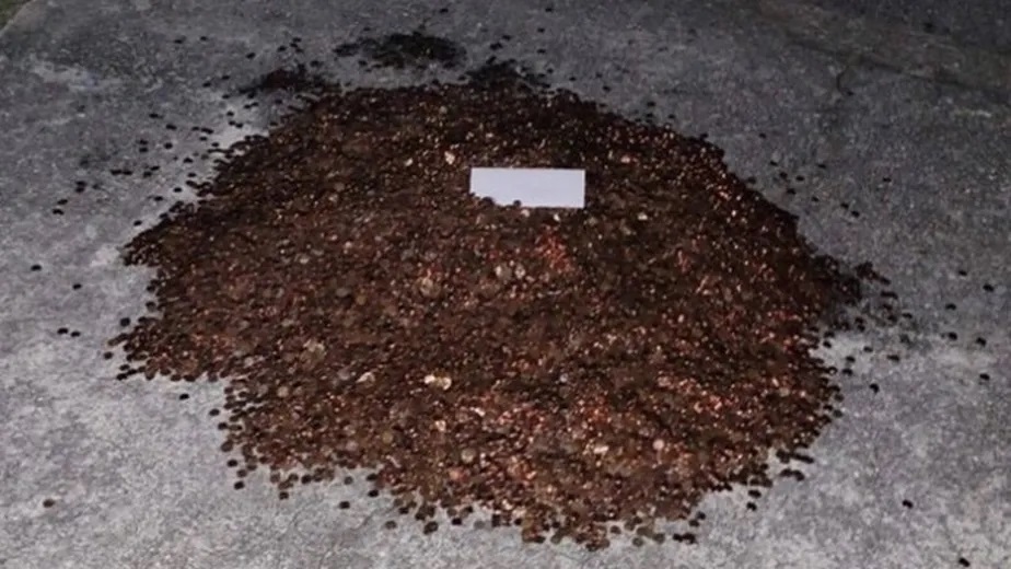 As moedas, todas sujas de graxa, pesavam cerca de 228 quilos. Elas foram deixadas por Miles na entrada da casa de Andreas.