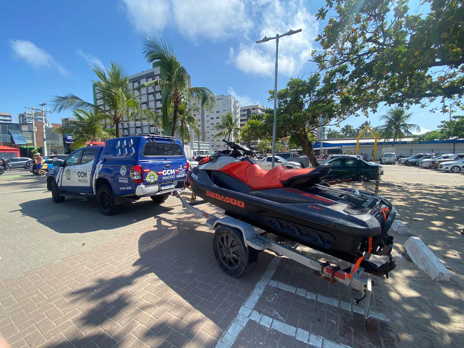 A Secretaria Municipal de Segurança Cidadã (Semsc), por meio da Fiscalização de Posturas e da Guarda Civil Municipal de Maceió (GCMM), com o apoio do Departamento Municipal de Transportes e Trânsito (DMTT), realizou, na manhã deste sábado, 11, uma operação integrada na orla da Pajuçara que resultou na apreensão de três Jet Skis utilizados de forma irregular para a comercialização de passeios sem autorização.