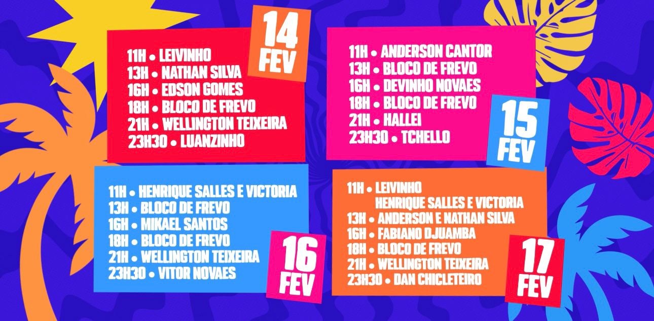 Este ano, a Prefeitura decidiu ampliar e diversificar a programação, que além dos desfiles de blocos com bandas de frevo e dos shows durante a noite, também contará com shows no durante o dia. A ideia é tornar a folia ainda mais dinâmica, com shows, blocos e manifestações culturais, valorizando artistas locais e as atrações reconhecidas nacionalmente.