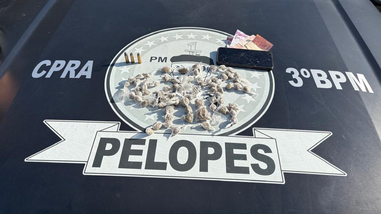 Dentro da sacola, os policiais encontraram uma quantidade de maconha, além de dinheiro trocado e munições de calibre .38. Ao todo, foram apreendidas 72 bombinhas de maconha, pesando aproximadamente 45 gramas, R$ 35,00 em espécie e três munições intactas.