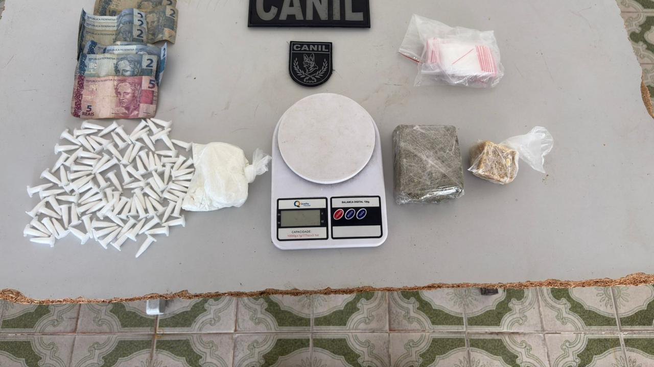 Ao todo, foram apreendidos 70 gramas de cocaína divididas em 100 pinos, mais 170 gramas da mesma substância, 245 gramas de maconha, 100 gramas de crack, além do dinheiro em espécie e a balança de precisão.