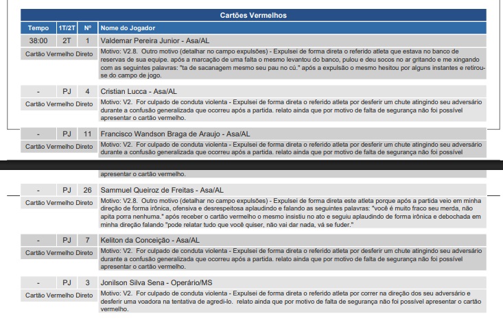 A eliminação do ASA na Copa do Brasil terminou em tumulto e com quatro jogadores expulsos, segundo relato do árbitro paranaense na súmula da partida. O documento descreve ofensas, agressões, invasão de campo e arremesso de objetos contra a equipe de arbitragem após o apito final.