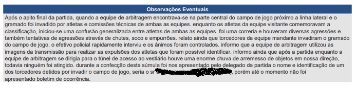 A súmula descreve ainda que, após o apito final, quando a equipe de arbitragem estava próxima à linha lateral, o gramado foi invadido por atletas e membros das comissões técnicas de ambas as equipes. Segundo o relato, “enquanto os atletas da equipe visitante comemoravam a classificação, iniciou-se uma confusão generalizada entre atletas de ambas as equipes”.