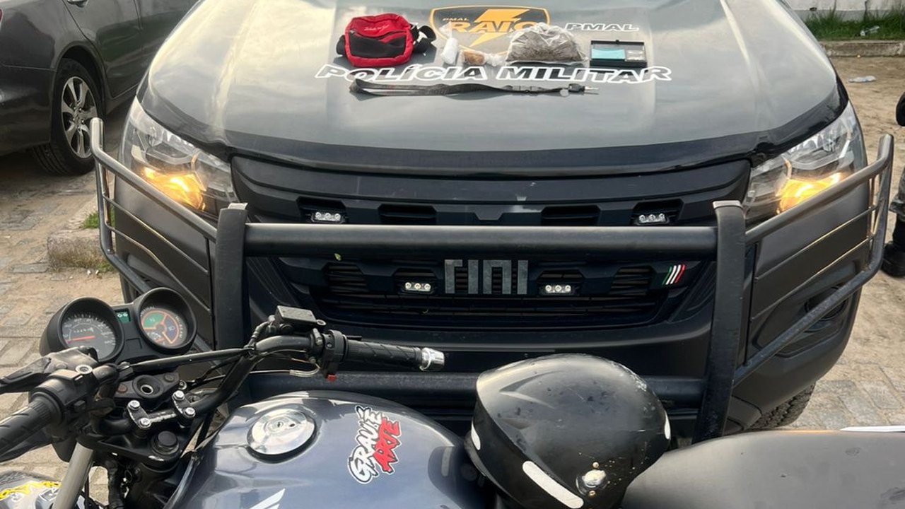 A guarnição RAIO Comando prendeu um homem de 23 anos, identificado como J.E.C dos S., após perseguição na região da Orla Lagunar, em Maceió. O suspeito estava baleado e portava drogas, balança de precisão e outros materiais.